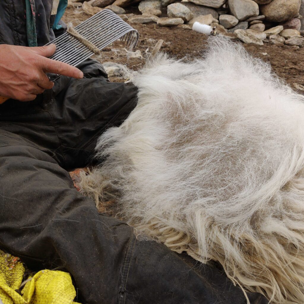 This is an extremely rare material and we at Kashperia every year make limited quantities in this collection as it takes the fleece of approximately 18 baby goats to make one shawl as the average yield of the yarn that can be used for spinning is 16 grams per animal
